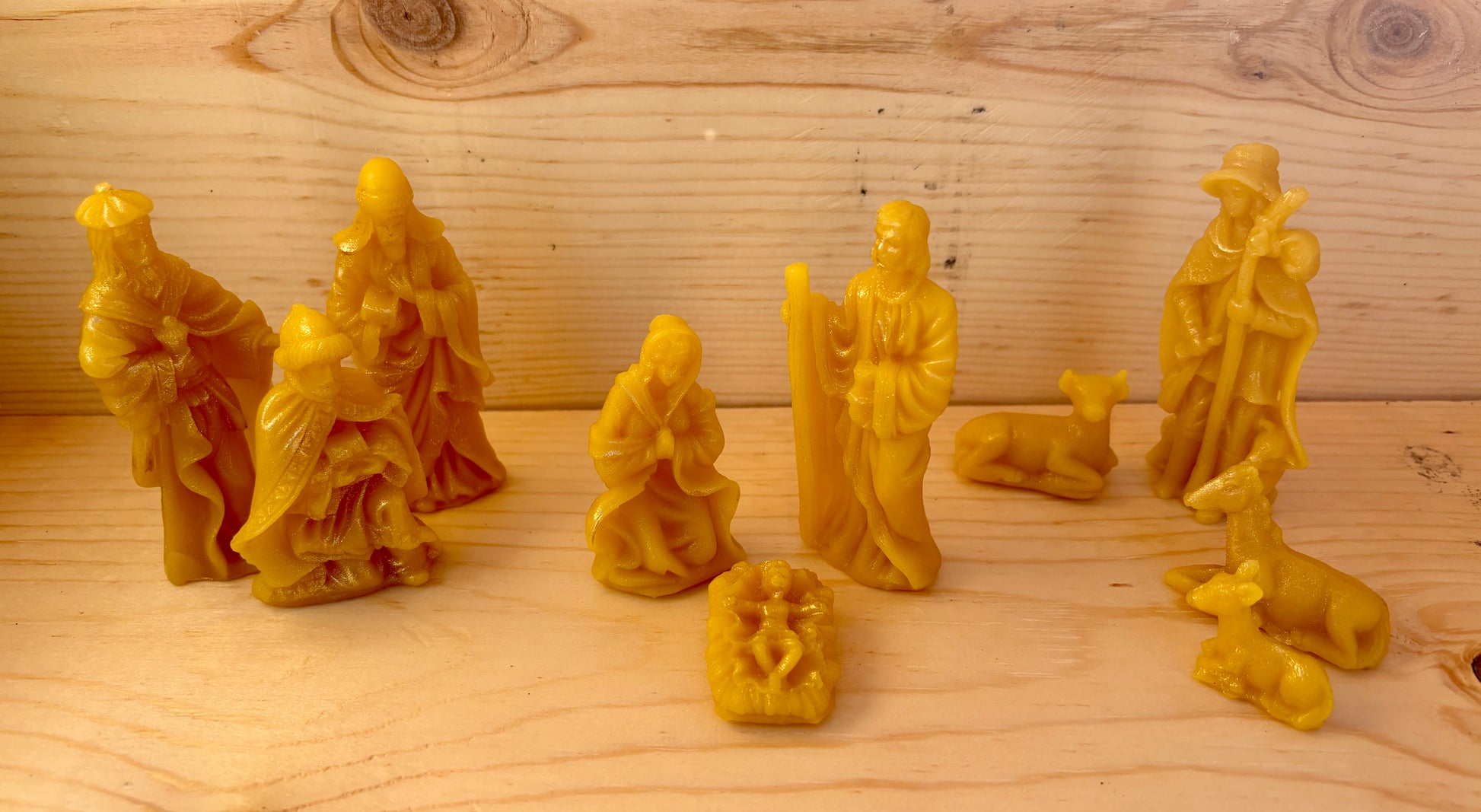 A delicate ten piece pure beeswax nativity set lightly dusted in gold. (Tallest piece is 3.5")